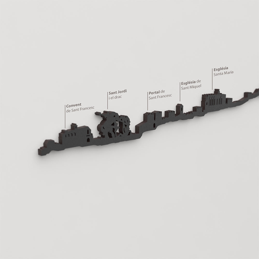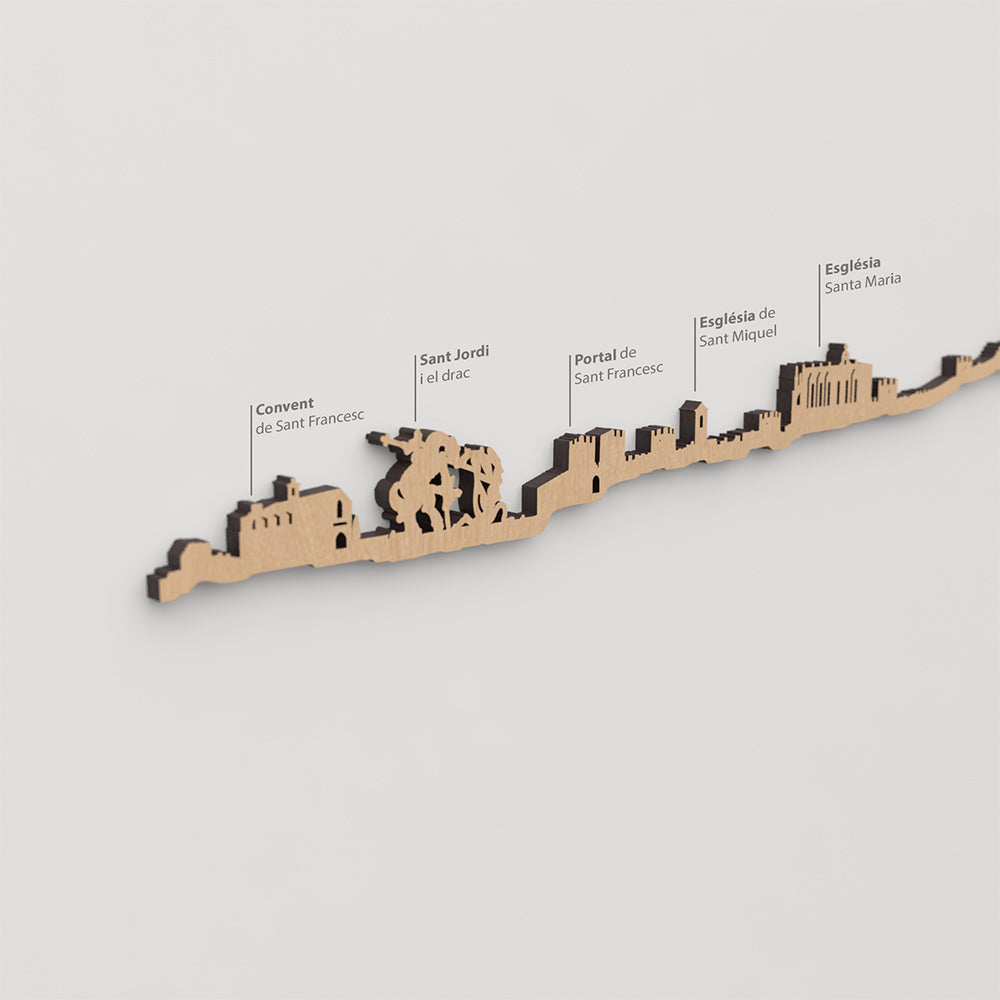 El skyline se adentra en el casco antiguo, donde emerge la Iglesia de Sant Miquel, integrada en el tejido medieval de calles estrechas y piedra histórica. La línea continúa siguiendo la muralla de Jaume II, que envuelve la ciudad hasta alcanzar el Portal de Sant Francesc, uno de los accesos más representativos del recinto amurallado.