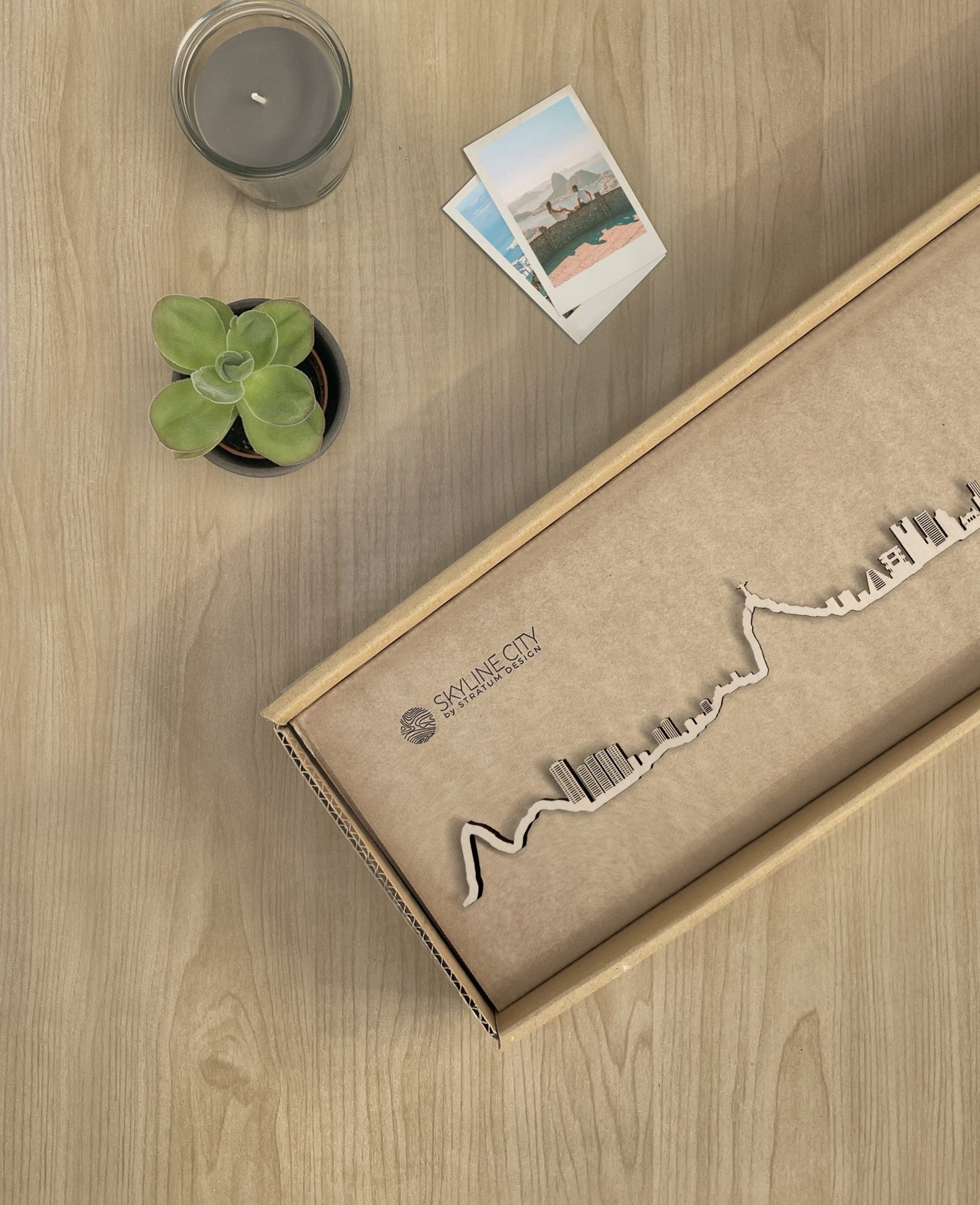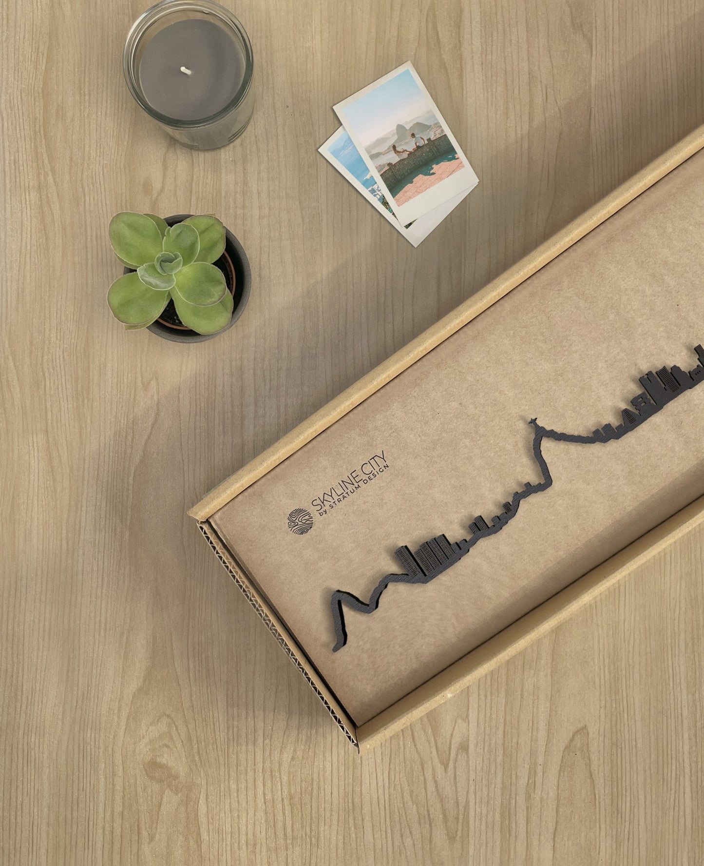 En la caja encontrarás todo lo necesario para disfrutar de tu skyline desde el primer momento: tu silueta del Skyline Río de Janeiro en el color y tamaño elegidos, 6 puntos adhesivos para su montaje, una tarjeta con la guía visual de instalación y un código QR para ver vídeos de colocación paso a paso.