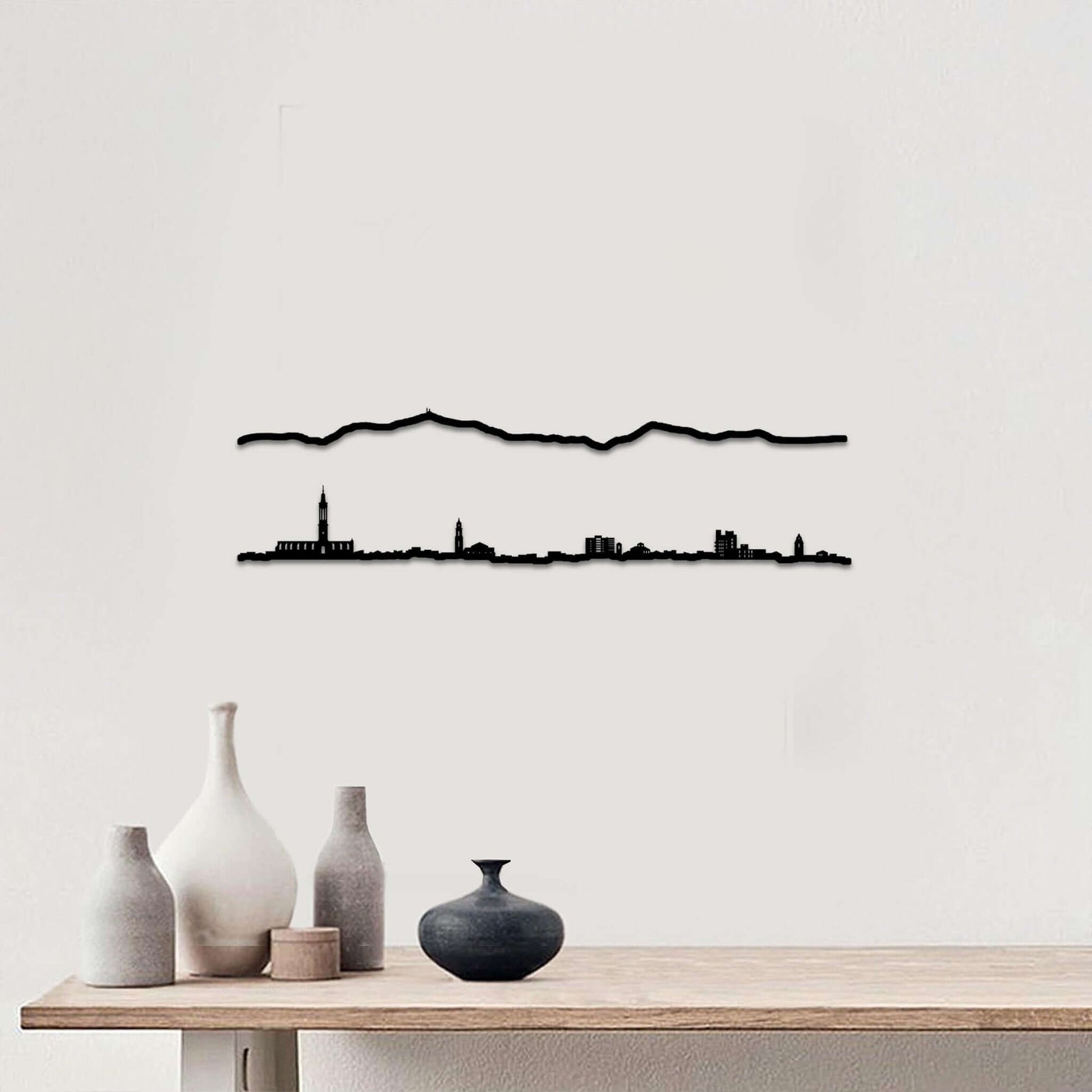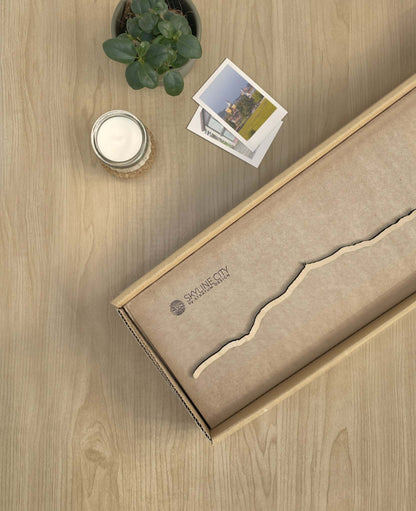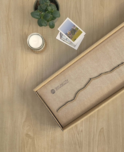 En la caja encontrarás todo lo necesario para disfrutar de tu skyline desde el primer momento: tu silueta del Skyline Parc Natural del Tossal Gros de Miramar en el color y tamaño elegidos, 6 puntos adhesivos para su montaje, una tarjeta con la guía visual de instalación y un código QR para ver vídeos de colocación paso a paso.